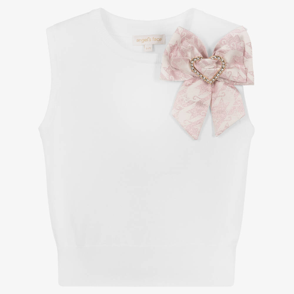 Smart off-white sweater vest for girls by Angel's Face, knitted in a soft cotton blend. It has a statement pink bow on the front with a shimmering cat jacquard pattern and a heart-shaped diamanté buckle. Attaching easily with poppers, the beautiful bow adds glamour to this versatile knitwear piece.