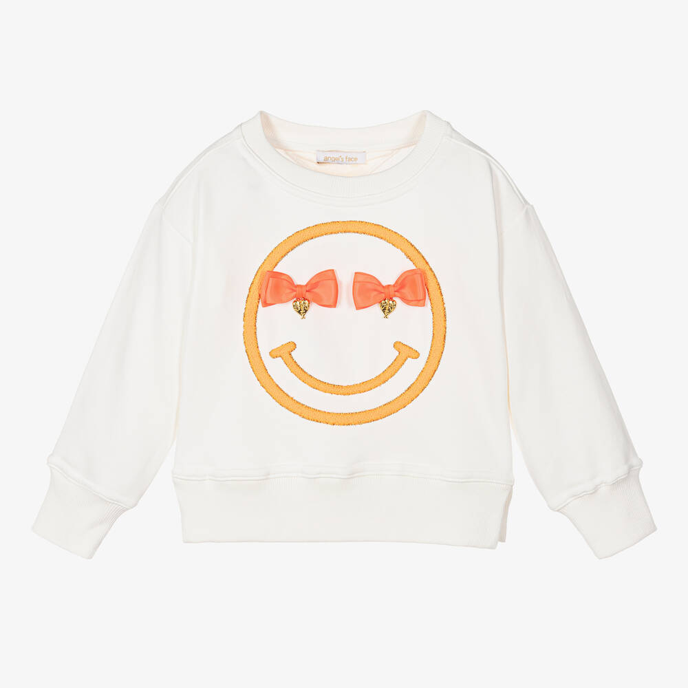 Off-white long-sleeved sweatshirt for girls by Angel's Face, made in soft jersey for casual wear. It has a relaxed, boxy fit and ribbed trims for added comfort. A bright, neon orange smiling face can be found appliquéd in the centre, with sparkly gold trims and raised bouclé texture. Fun and playful, the designer's signature heart charm and bow shapes the eyes on the happy motif.