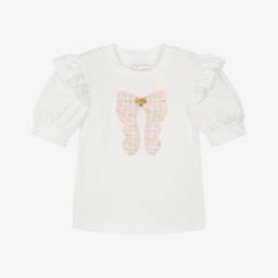 Girls off-white and neon pink T-shirt by Angel's Face, with a fun twist. The statement short sleeves are made with neon pink, gathered tulle for a stand-out look. It is made in soft and comfortable cotton jersey, with a signature bow and golden heart charm on the neckline for a logo-inspired finish.