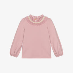 Off-white long-sleeved top for girls by Angel's Face, featuring a gorgeous pleated tulle collar, adorned with pearl beads and sparkly gold thread. Made in soft and comfortable cotton jersey with gently puffed sleeves and elasticated cuffs, it has a stylish keyhole button fastening on the back of the neck.