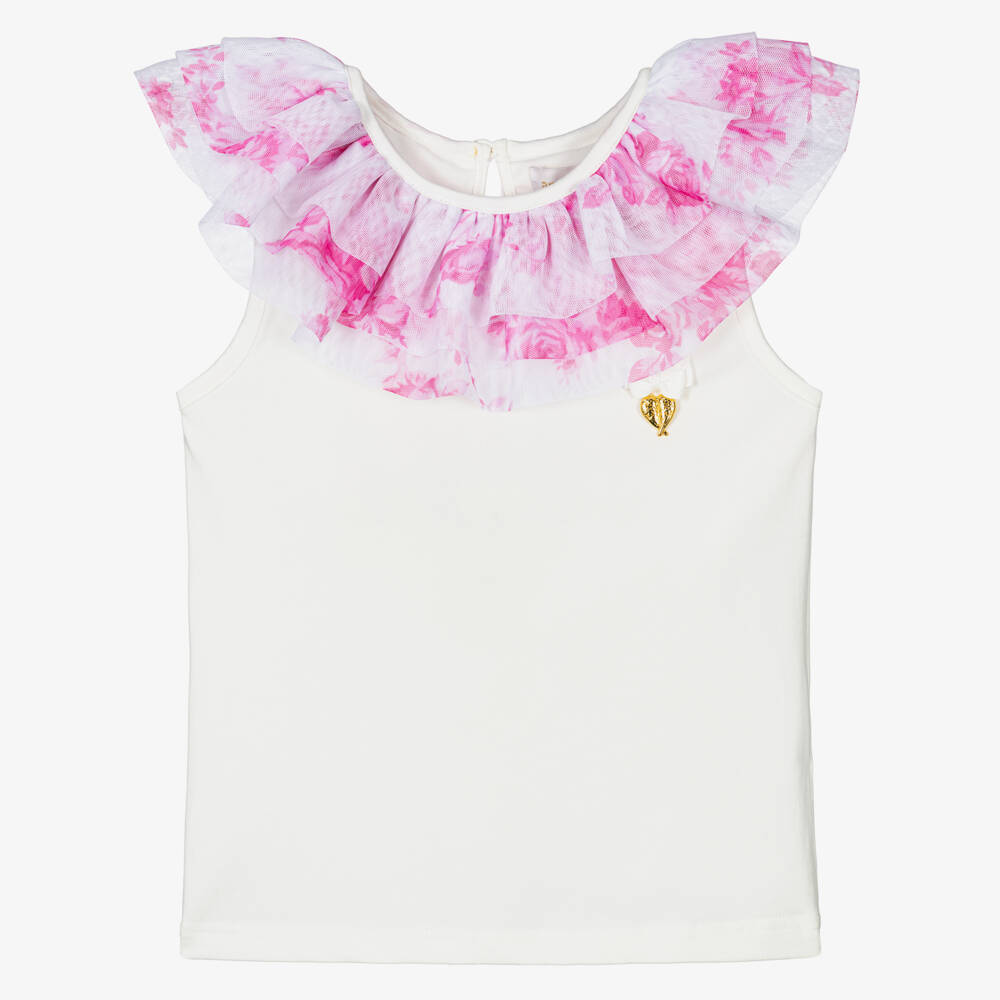 Off-white T-shirt for girls by Angel's Face, made in soft cotton jersey. This comfortable sleeveless top has a pretty white layered tulle ruffle around the neck patterned with pink flowers. The brand's signature angel wings heart charm and bow feature on the chest and there is a single keyhole button fastening on the back.