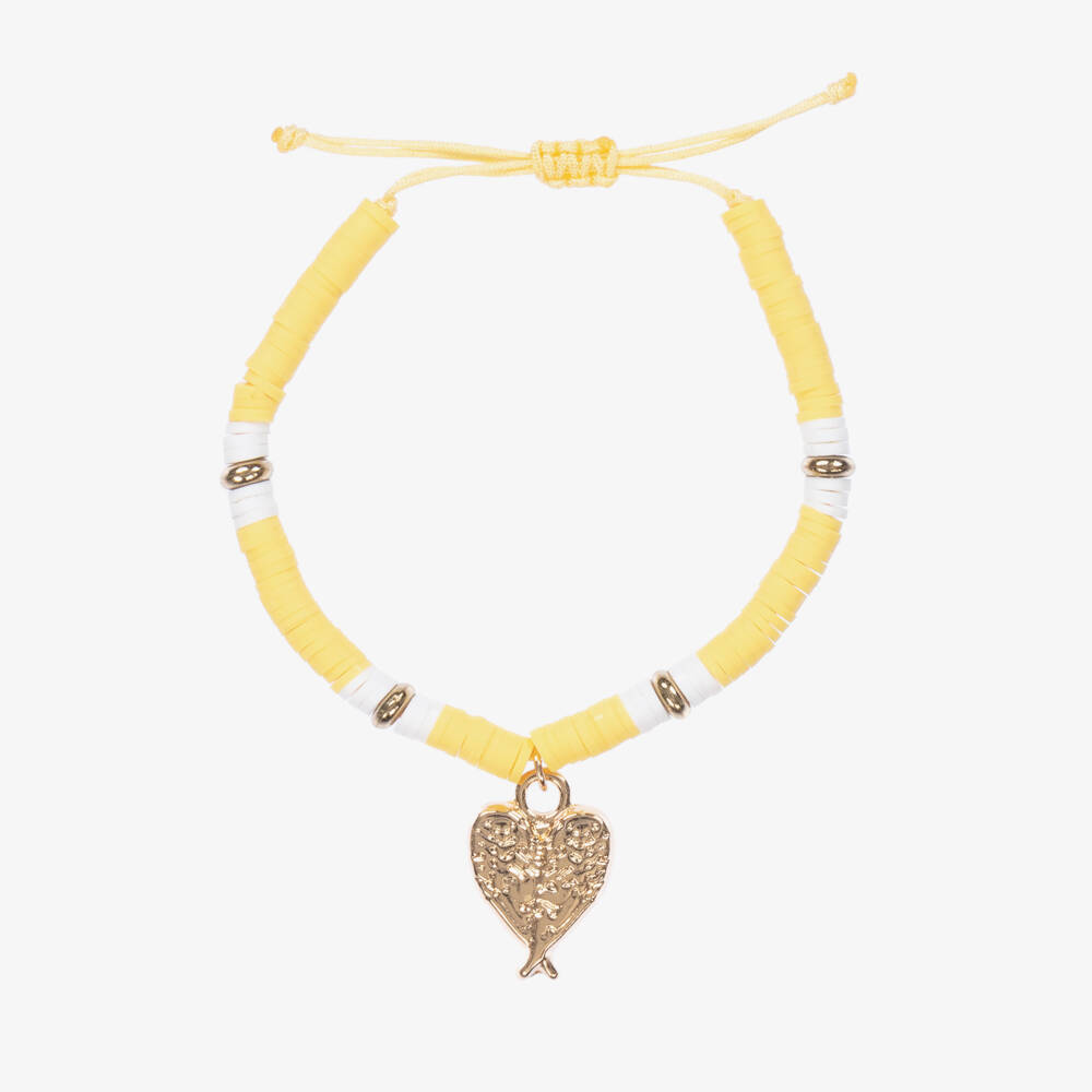 Pretty yellow beaded bracelet for girls, by British designer Angel's Face. A cute accessory with added sparkle, it is made of yellow and white beads with the brand's signature heart logo charm in gold.