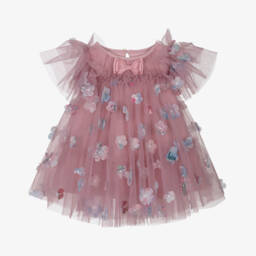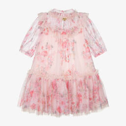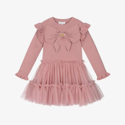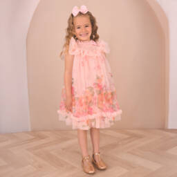 From Angel's Face for girls, a pretty yellow tulle dress with a soft, comfortable jersey lining. This simple style is elevated with ruffles of rainbow tulle in pastel hues and a pretty flower appliqué.