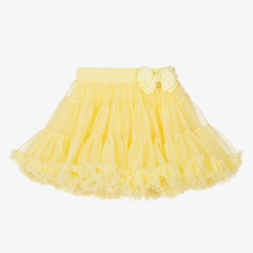 Fun and girlie, a bright yellow tutu skirt for girls by British brand Angel's Face. Made in layers of soft tulle, this playful design has a gorgeous ruffle hem adding fullness and bounce, with a soft and stretchy jersey lining for comfort. Easy to wear, it has a comfortable elasticated waistband featuring the signature bow and gold heart logo charm for a sweet designer look.