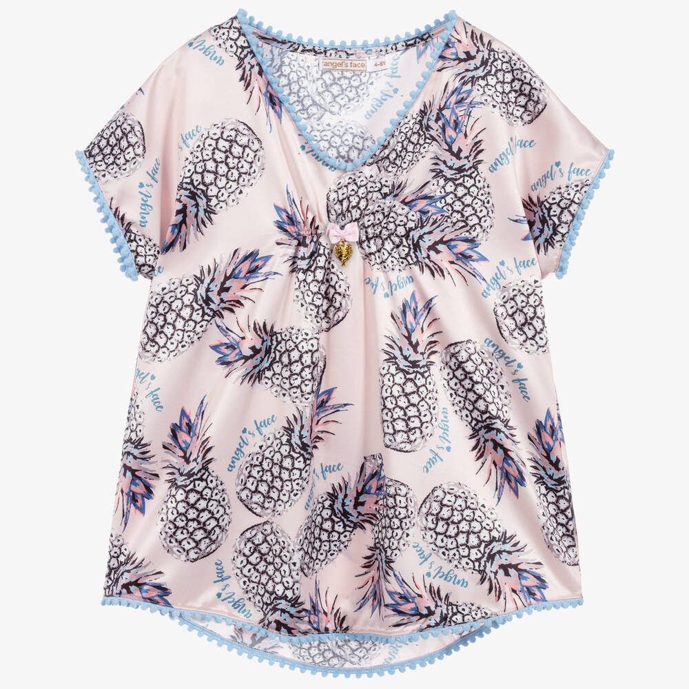 A pretty pink kaftan for girls by Angel's Face, made from silky, lightweight polyester. This lovely cover-up is ideal for around the beach or pool and has a pretty white pineapple print. The edges are trimmed with fun blue pom-poms and the chest is lightly elasticated.