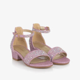 Stunning rose gold heeled sandals for girls by British designer, Angel's Face. Ideal for dazzling at special occasions, they are encrusted with beautiful diamantés and covered in sparkling glitter. They fasten with a heart-shaped buckle strap around the ankle, and have a soft faux leather insole. These glamorous party shoes have a raised heel for an elevated finish and a rubberised sole for improved grip.