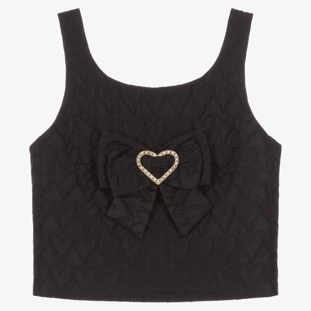 A black sleeveless top for teen girls by Angel's Face, designed in lightweight jacquard with a raised heart pattern. Ideal for parties or other occasions, this fully lined top has a detachable bow on the front with a gold-tone, heart-shaped buckle in the centre. The diamanté decoration adds a touch of sparkle. Cut-out detailing on the back is shaped with a gold button fastening and an elasticated panel below.