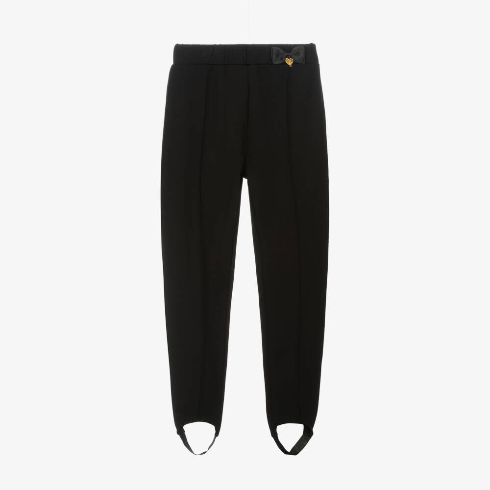 Trimmed with the brand's signature grosgrain bow and golden angel wings charm, these stylish black trousers for teen girls are by Angel's Face. They are made in stretchy Milano jersey and have elegant seams down the front. There is a comfortable elasticated waist, with stretchy stirrups on the feet.