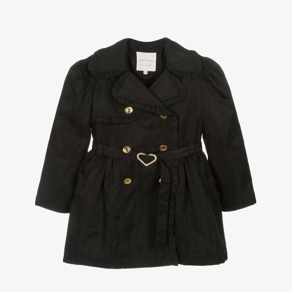 Trimmed with feminine ruffes and stand-out gold button fastenings, this glamorous black trench coat for teen girls is by Angel's Face. It has elegant puffed sleeves and an eye-catching sparkling diamanté heart on the detachable belt. Made in silky smooth fabric, the coat has a lightweight silky lining and concealed front pockets.