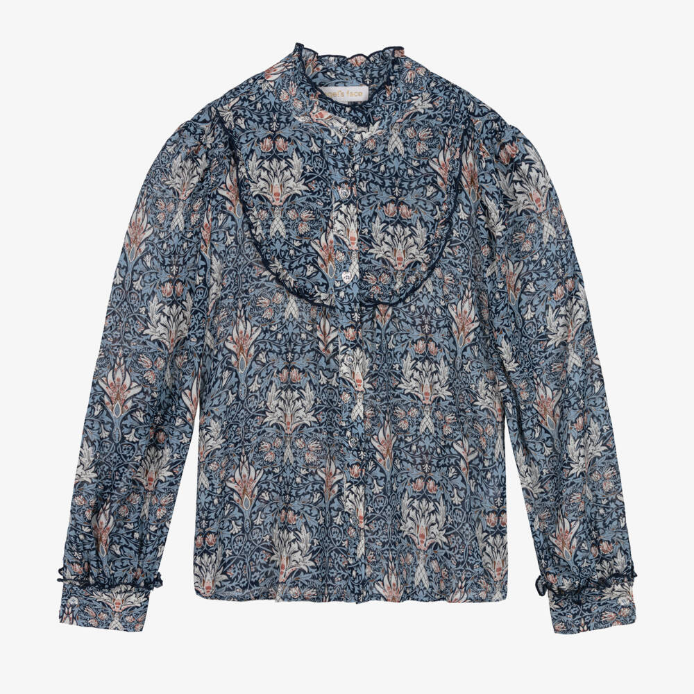 From British brand Angel's Face for teen girls, a beautiful blue chiffon blouse. It features an intricate filigree floral pattern in blue, white and pink, with a hint of glitter sparkle. Sheer and lightweight, the blouse has elegant ruffle trims and fastens with silver-tone branded heart buttons for a designer finishing touch.