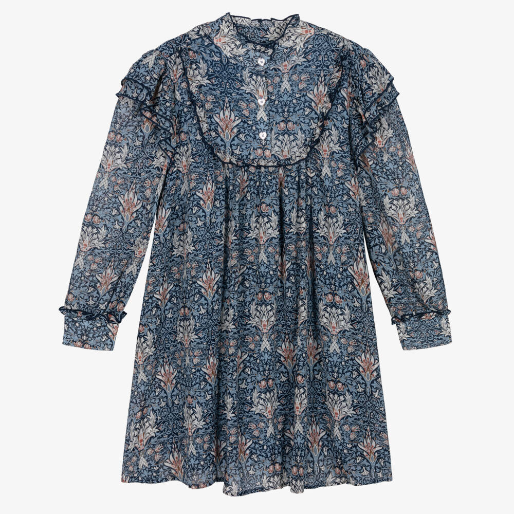Beautiful blue chiffon dress for teen girls by British brand, Angel's Face. It features an intricate filigree floral pattern in blue, white and pink, with a hint of glitter sparkle. Sheer and lightweight this elegant design has feminine ruffle trims and silver-tone branded heart button fastenings. The dress has a comfortable and lightweight crêpe lining.