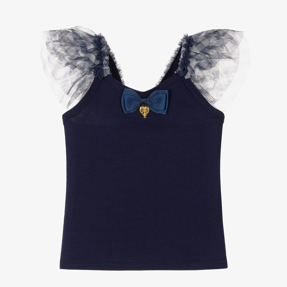 A navy-blue vest top for teen girls from Angel's Face. The narrow shoulder straps are trimmed with layers of gingham tulle ruffles for an eye-catching effect. Soft, stretchy and comfortable in jersey, this sleeveless cotton top is ideal for warmer weather. The brand's signature golden metal heart charm and grosgrain bow is stitched on the front to add a touch of sparkle to an outfit.