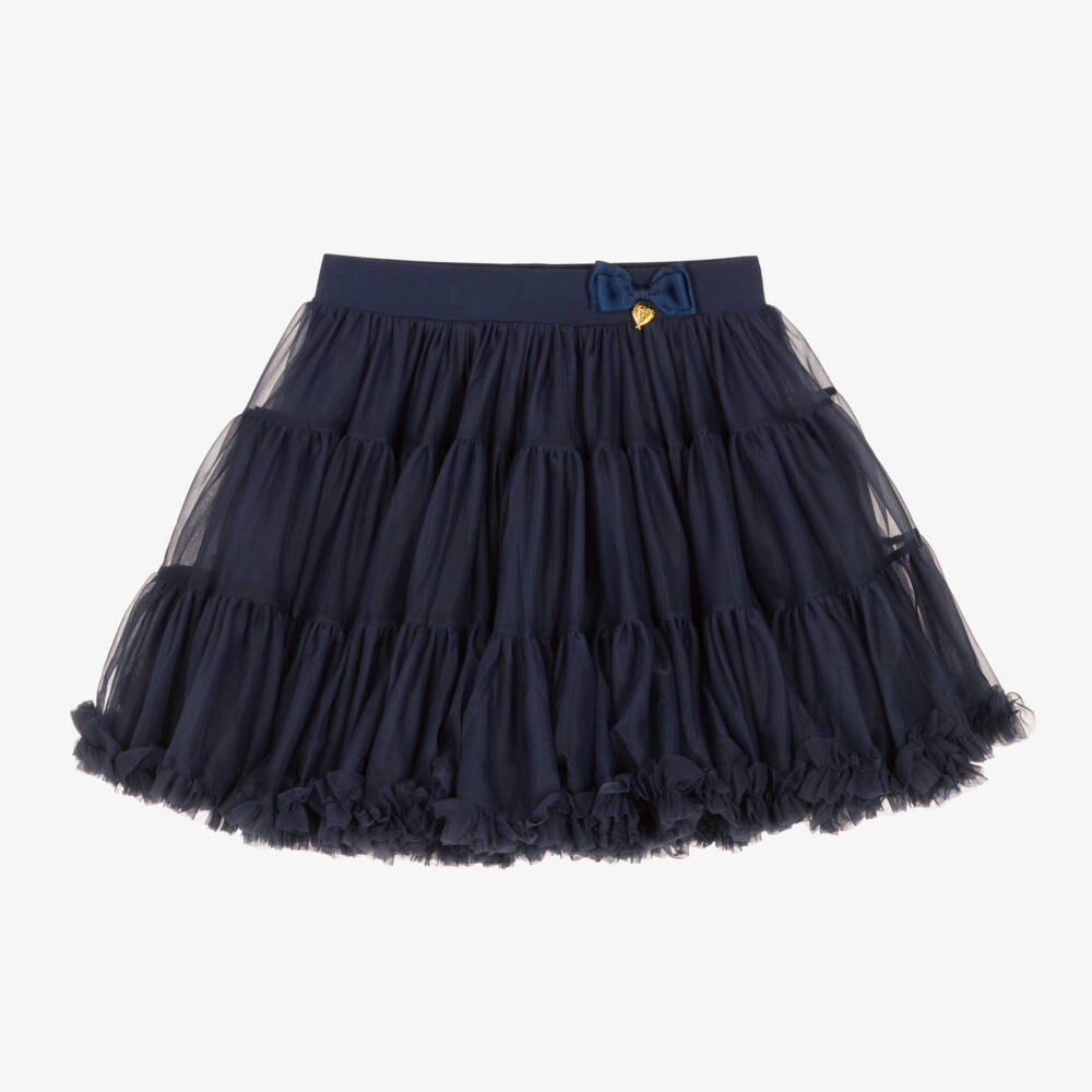 This navy blue tulle tutu skirt for teen girls by Angel's Face features the designer's bow and golden wings charm on the waistband, for that signature girlie look. Designed with layers of soft tulle for a gorgeous full effect, it has a ruffle hem that creates a stand-out, bouncy look. A soft and stretchy jersey lining and comfortable elasticated waistband, complete this playful design.