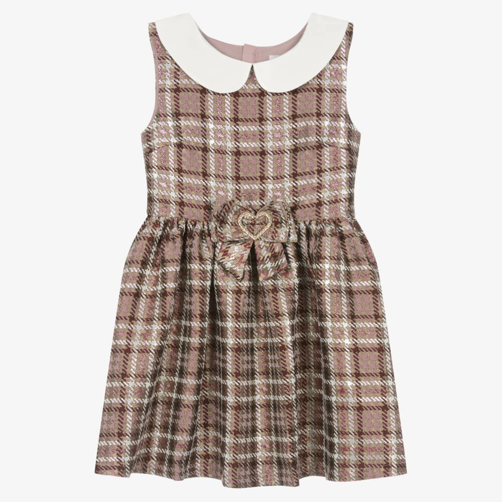 A sleeveless dress for teen girls by Angel's Face, designed in a pink, beige and red houndstooth check with an ivory satin twill collar. Lovely for special occasions, it is made in satin jacquard and woven with glittery thread which shimmers beautifully in the light. It has a detachable bow appliqué on the waistline, with a heart-shaped diamanté buckle in the centre for a feminine look. Fully lined, it has an exposed gold zip on the back, with the British brand's signature heart charm on the pull.