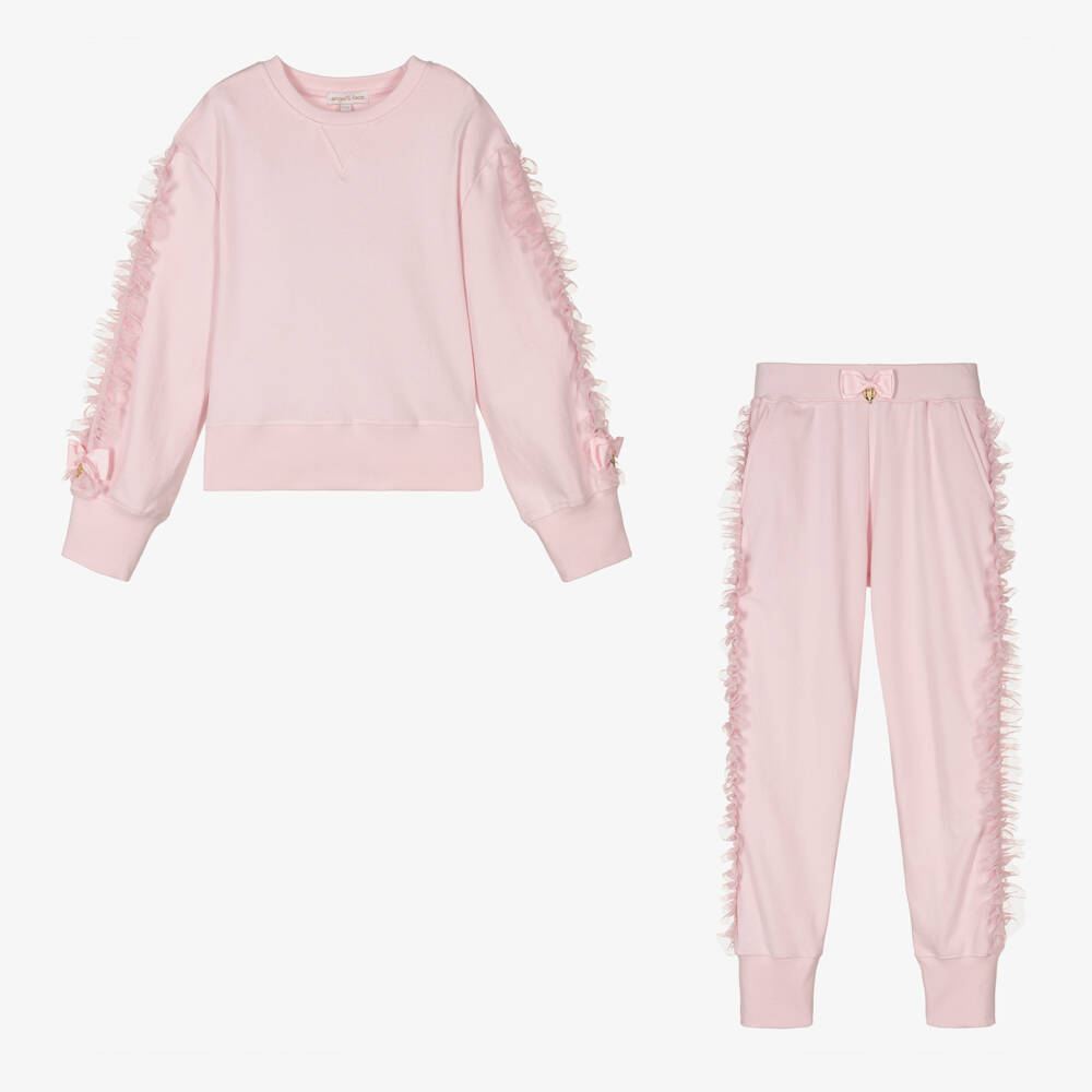 Pretty pink cotton tracksuit for teen girls by British brand Angel's Face, trimmed in feminine grosgrain ribbon and tulle. Signature golden heart charms and grosgrain bows are on the cuffs and waistband for instant designer recognition. Made in comfortable jersey with ribbed trims, it is ideal for relaxing in style.