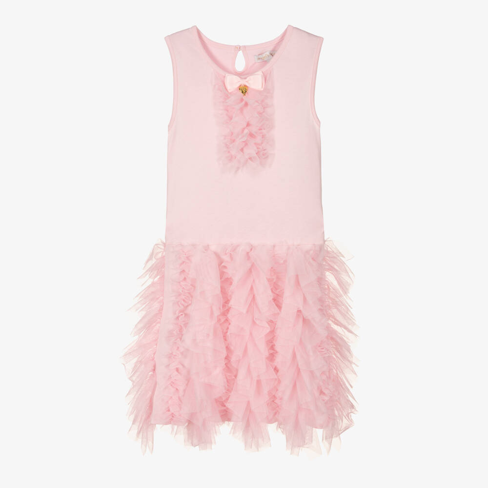 Gorgeous pink cotton blend dress for teen girls by British brand Angel's Face, ideal for special occasions or simply to make the everyday a little less ordinary. Made in comfortable jersey, it has the designer's signature golden heart charm and grosgrain bow on the neckline, with fun ruffles on the bodice and the skirt. It fastens with a golden logo button around the back.