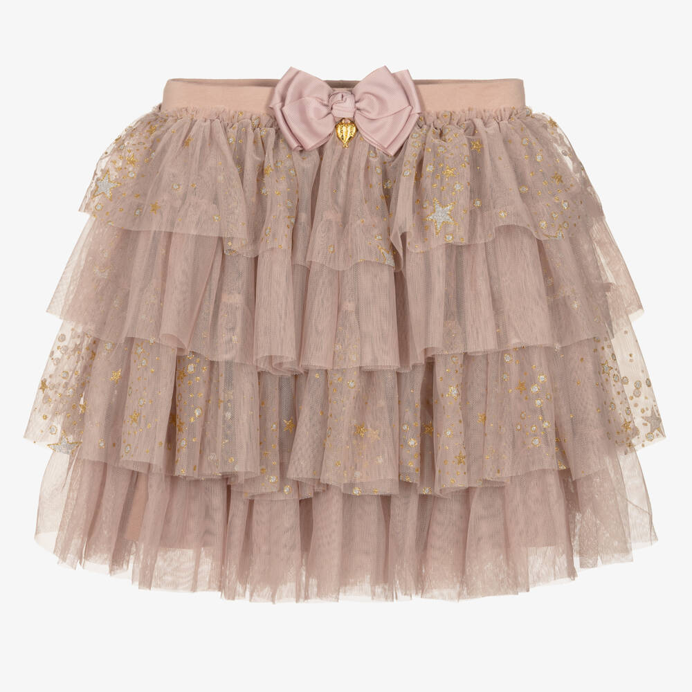 Frilly and fun, a dusky pink skirt for teen girls by Angel's Face, with the designer's signature bow and gold heart charm on the front. Made in soft, tiered tulle, alternate layers are patterned with glittery gold and silver stars that catch the light beautifully. This girly romantic style can be dressed up for special occasions or paired with something more relaxed for a smart casual ensemble. Easy to wear, it has a comfortable elasticated waistband and a soft jersey lining.