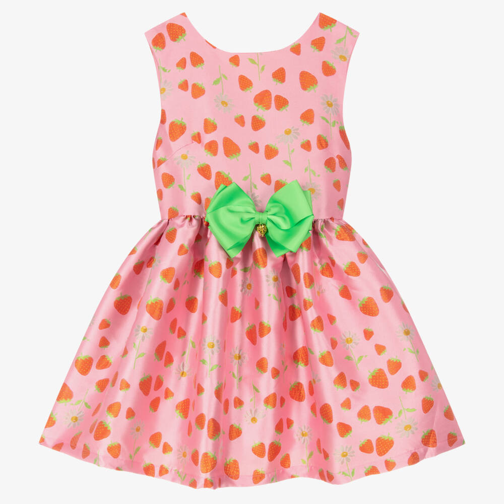 A pink, fit and flare dress for teen girls by Angel's Face, in a lovely red and green strawberry jacquard pattern with a subtle sheen. The waist is gathered for a stunningly flared skirt, with a statement green grosgrain bow and gold heart charm, a signature look of the brand. There is an exposed golden zip with the iconic heart charm to fasten on the V-back.
