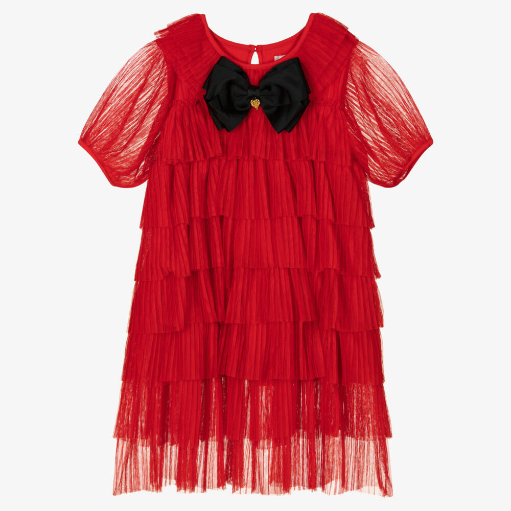 Statement red dress for teen girls by Angel's Face, layered of luxurious tiers of pleated tulle. The dramatic silhouette demands attention with its oversized black bow and a shiny gold logo charm. Lined in soft cotton jersey for added comfort, it has a stylish branded button fastening on the back and puffed sleeves for a glamorous finishing touch.