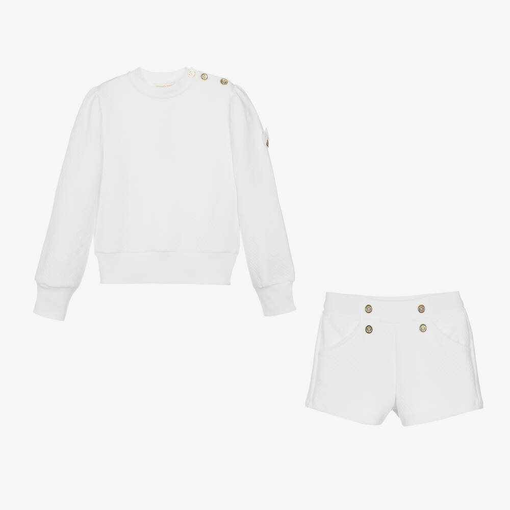 For a chic yet casual style, this off-white shorts set for teen girls is from British brand, Angel's Face. In a diamond-quilted effect, the sweatshirt has a glam grosgrain bow on one sleeve, with the brand's beautiful heart charm and bow appliqué. It has puff sleeves, with eye-catching gold logo button fastenings on the shoulder. The shorts are adorned with gold buttons, slant pockets and an elasticated waist for effortless coordination.