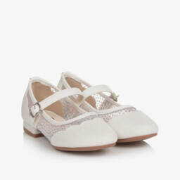 Gold special occasion sandals for teen girls by Angel's Face, made in soft metallic crackle effect faux leather. They are trimmed with a grosgrain ribbon bow on the back and fasten with a gold and diamante heart-shaped buckle. The outer sole is in non-slip rubber and they have a 3cm heel for a touch of elegance.