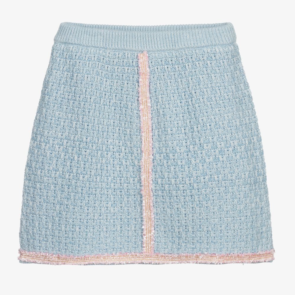 Teen girls pale blue skirt from Angel's Face, knitted in soft and mid-weight cotton. Pink and gold lace decorates the hemline and a central panel down the centre. It is fully lined in super-soft modal jersey and has an elasticated waistband.