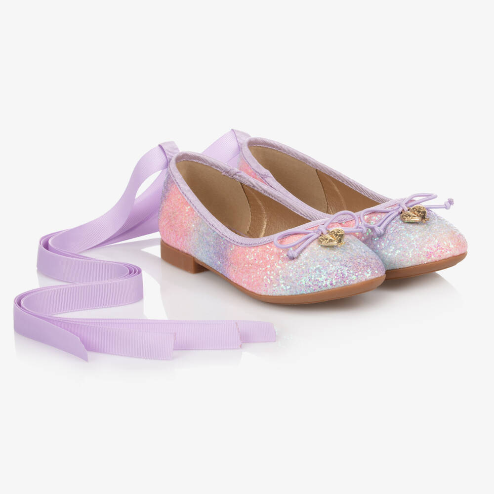 Pink and lilac purple ombré ballerina shoes for teen girls from Angel's Face, with glittery uppers. Trimmed with the brand's signature bow and gold angel wings charm, they have pink grosgrain ribbons on the back to tie across the ankle. The outer and lining are made in soft faux leather, with purple satin trims.