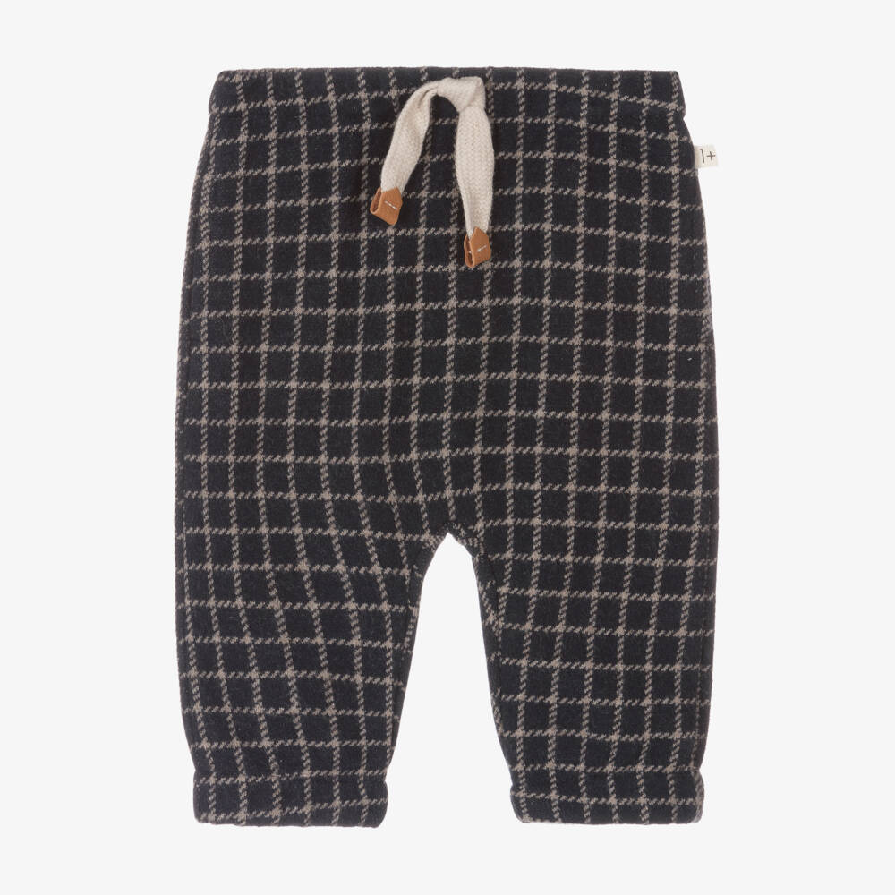 Navy blue and beige checked trousers for little boys by 1 + in the family, made in a mid-weight brushed cotton jersey blend. These casual, jogger style trousers have a comfortable elasticated waistband, cuffs and concealed side seam pockets. They have a little logo tab on one leg and a woven ivory faux drawstring on the front with faux leather trims.