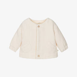 Ivory cotton dungarees for little boys and girls by 1 + in the family, with a beige check. Woven with a subtle lattice weave, they have button fastenings on the front and a cute pocket around the back.