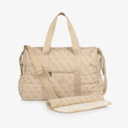 An ivory changing bag by 1 + in the family, made in soft sherpa fleece. Patterned in a charming beige and grey check design, this spacious bag is lined in soft canvas. There are three internal slip pockets and a useful zip-up pocket, ideal for organising baby's essentials. It fastens across the top with a zip and is detailed with a tan brown leather logo tab on the front. The carry handles are secured together with a popper fastening leather strap and the shoulder strap has poppers to adjust the length, allowing it to be carried on the pram or stroller.