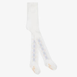 Delightful ivory tights for baby girls from Little A by A Dee, made from a soft knit. They have gold diamanté teddy bear motifs and silky ribbon appliqué bows for a sweet look. The elasticated waist ensures a comfortable fit and there are pale pink jacquard logos on the soles of the feet for subtle branding.