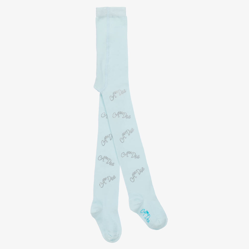 Pretty pale blue tights for girls by A Dee, made in a soft and stretchy cotton-rich blend. Comfortable for all-day wear, they have sparkly diamanté logos on each leg.