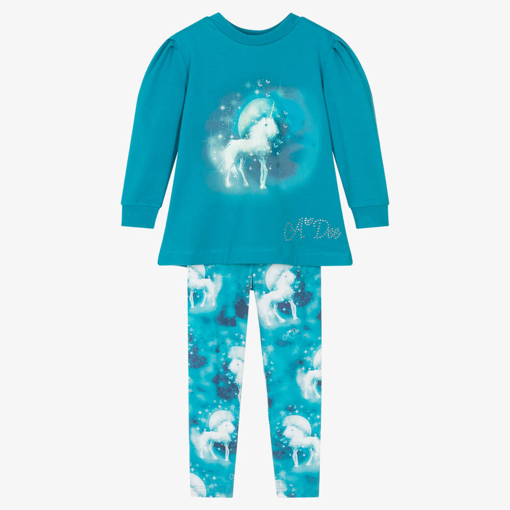 Turquoise blue leggings set for girls by A Dee, made in a soft cotton jersey. The top has a lovely unicorn motif on the front, puffed long sleeves with a contrasting unicorn patterned panel and bow on the back. A diamanté logo adds a touch of sparkle. The coordinating unicorn leggings feature the designer's name and have a comfortable elasticated waistband.