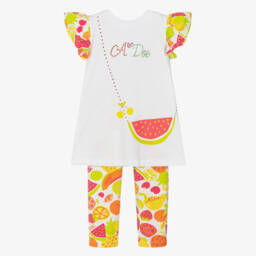 Pale blue cotton leggings set for girls by British brand A Dee. Made in comfortable jersey with a warm, fleecy inside, the top has a super soft, cosy, faux fur hood and a matching pouch pocket. There is a sparkling diamanté logo on the front, neat, ribbed cuffs on the long sleeves and vents on the side seams. The full length jersey leggings have a comfortable, elasticated waistband and a diamante 'A' on one ankle. The set is easy to wear, with both pieces simply pulling on.