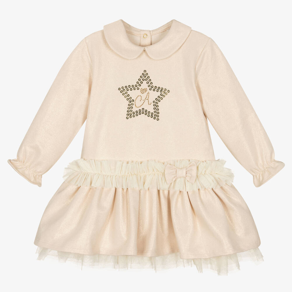 Pretty shimmery gold dress for little girls by A Dee, made in soft, mid-weight cotton jersey, with a warm and cosy fleecy inside. This cute dress has a rounded collar and a gold sequin and diamanté logo on the front. It has a dropped waist with a ruffle hem and a tulle and bow trim. There are additional layers of soft glittery tulle as a lining on the skirt to add extra volume. It fastens with poppers on the back.
