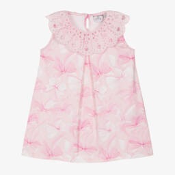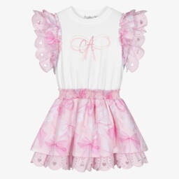 A coral orange T-shirt dress by A Dee for girls, with a soft cotton jersey bodice and silky smooth skirt. A striped lollipop illustration on the chest and the diamanté logo give a touch of sparkle to this comfortable dress. The flared skirt is patterned with multicoloured stripes and has a tulle underskirt for added volume.