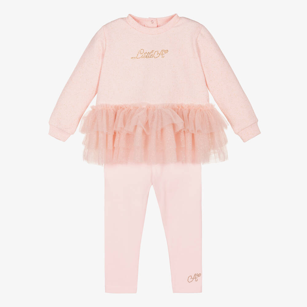 A pale pink leggings set for little girls from Little A by A Dee, made from soft cotton jersey. Speckled in gold glitter, the sweatshirt style tunic top has a layered sparkly tulle skirt trim, a gold studded logo on the chest, and practical popper fastenings on the back. The full-length leggings have a smaller studded logo on one ankle and an elasticated waist for a comfortable fit.