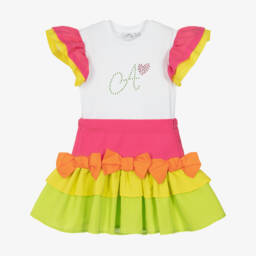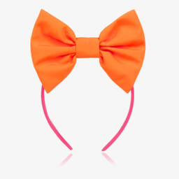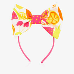 White headband for little girls from Little A by A Dee, made in soft cotton jersey. This lovely accessory is patterned with cute beige bunnies and pink flowers and features a large bow on the front for a sweet finish.