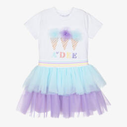 A lovely white and blossom pink skirt set for girls by A Dee. The jersey T-shirt has frilly sleeves, a patterned collar and a neat keyhole button on the back of the neck. There is a floral bouquet printed on the front with a fabric bow stitched below. The matching skirt has a beautiful layered silhouette in contrasting stripe and floral patterns. The waistband is elasticated for added comfort.