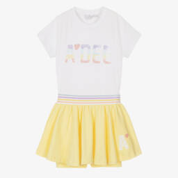 طقم تنورة قطن لون أبيض وزهري للبنات