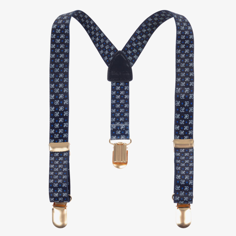 Navy blue cross-strap braces for baby boys from Spanish designer Abel & Lula, patterned with the brand's monogram. Super soft and stretchy, they are adjustable for a great fit, and attach to trousers or shorts with sturdy golden metal clips.