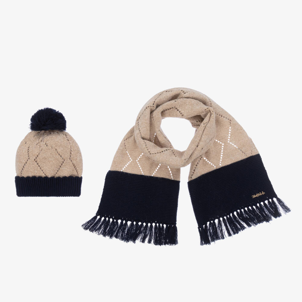 Add a touch of sparkle to those colder days with this gorgeous beige and navy blue hat set for girls by Spanish brand Abel & Lula. It is knitted in a soft wool blend with a sparkling golden thread running through. The cosy hat has a turned-up brim with a large pom-pom on the top. It comes with a matching scarf that has sweet tassel trims and a gold metal logo charm, for an added designer touch.