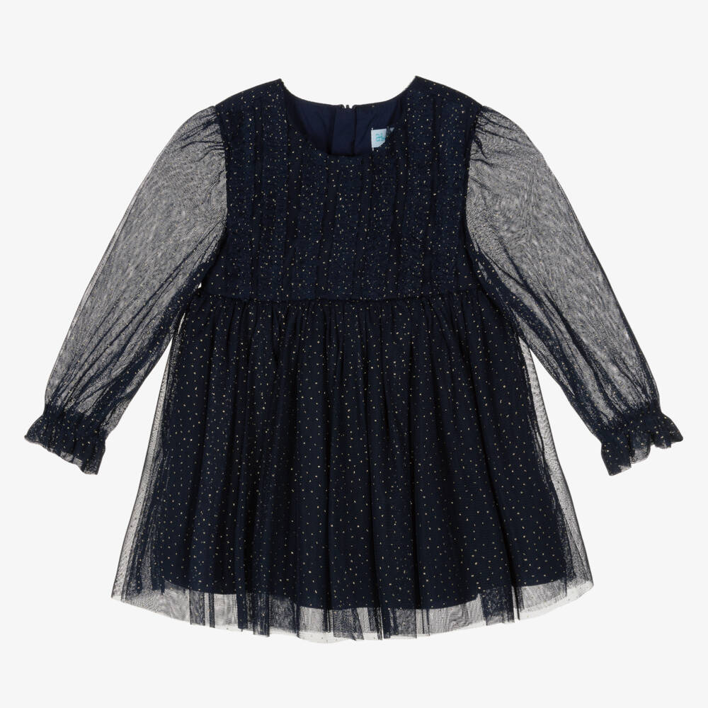 A pretty navy blue tulle dress for little girls by Spanish brand Abel & Lula. Speckled with gold foil for a glittery effect, this cute style has sheer long sleeves and gently elasticated cuffs. There are vertical ruffle trims on the bodice for added texture and a practical zip fastening on the back. The cotton poplin lining is comfortable on delicate skin and adds volume to the skirt.