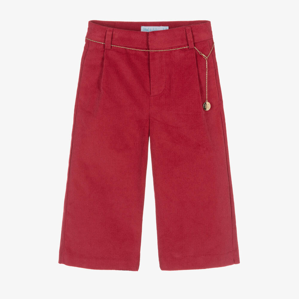 Deep pink wide leg trousers for girls by Abel & Lula, made in fine cotton needlecord. Casual but stylish, they have side seam pockets and a useful adjustable waist. They fasten with a hook and zip on the front and have a removable gold metal chain belt, with a logo charm.