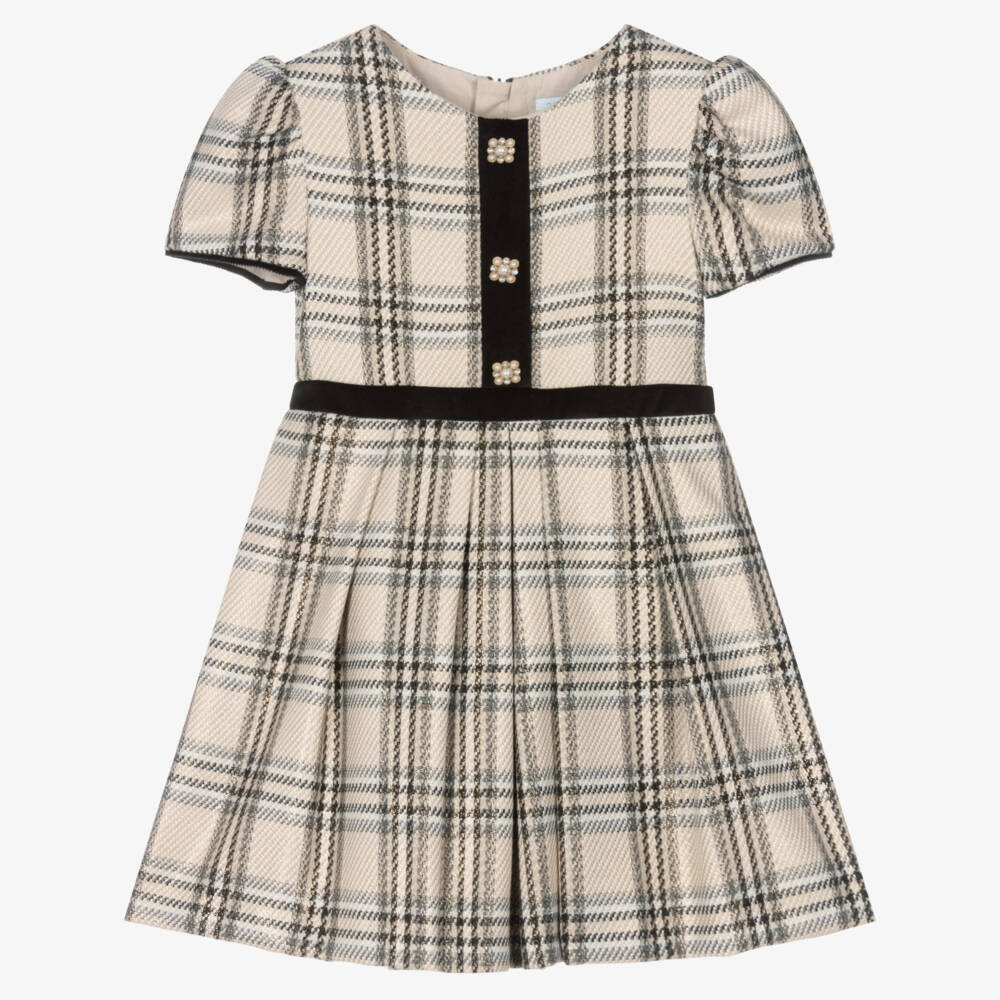 Ivory dress for girls by Abel & Lula, woven in soft viscose blend fabric with a shimmering gold lurex weave. In a black, white and grey tartan check, this smart style has short puff sleeves and decorative faux pearl and diamanté buttons on the front. There are black velvet trims on the bodice and around the waist for a contrast in textures. The pleated skirt is lined with soft voile, as well as a layer of structured tulle for added volume. It fastens on the back with a neatly concealed zip.