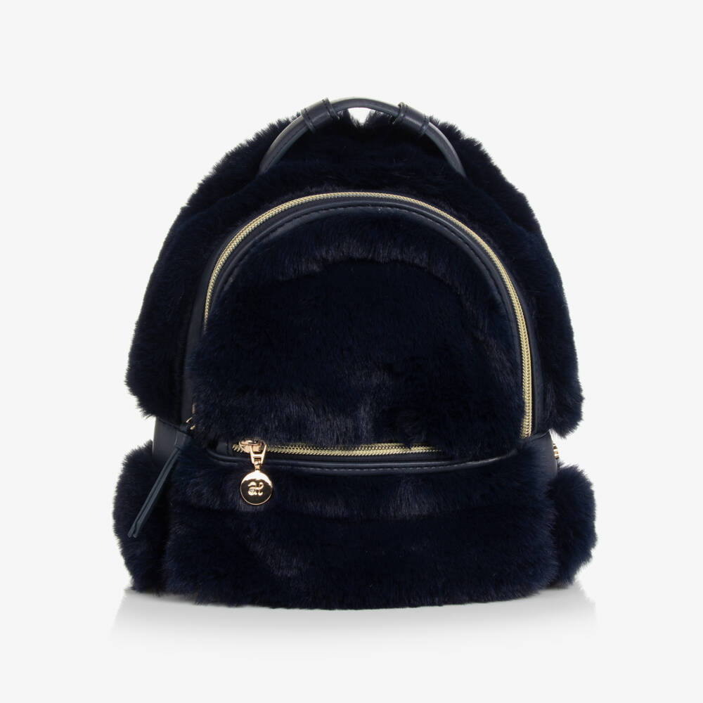 Cute navy blue backpack for girls by Abel & Lula, made in soft plush faux fur with stylish faux leather trims. The main compartment fastens with a shiny gold zip, and it has a useful smaller pocket on the front for extra space. The adjustable shoulder straps offer a great fit to this girly accessory.