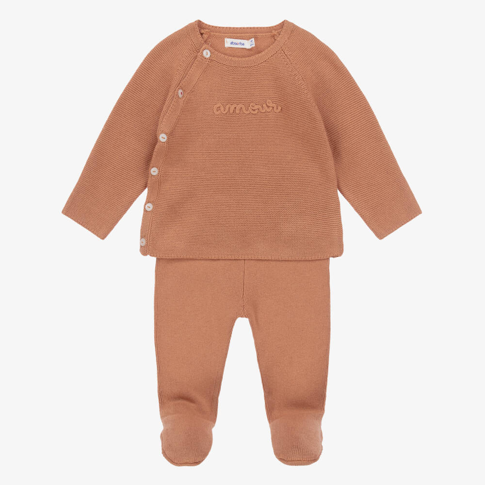 Lovely terracotta brown knitted babygrow for boys and girls by Absorba. Knitted in a soft cotton blend, this comfortable two piece has 'amour' embroidered on the front and asymmetric front button fastenings. The coordinating trousers have enclosed feet and a wide, turn-down waistband for comfort.