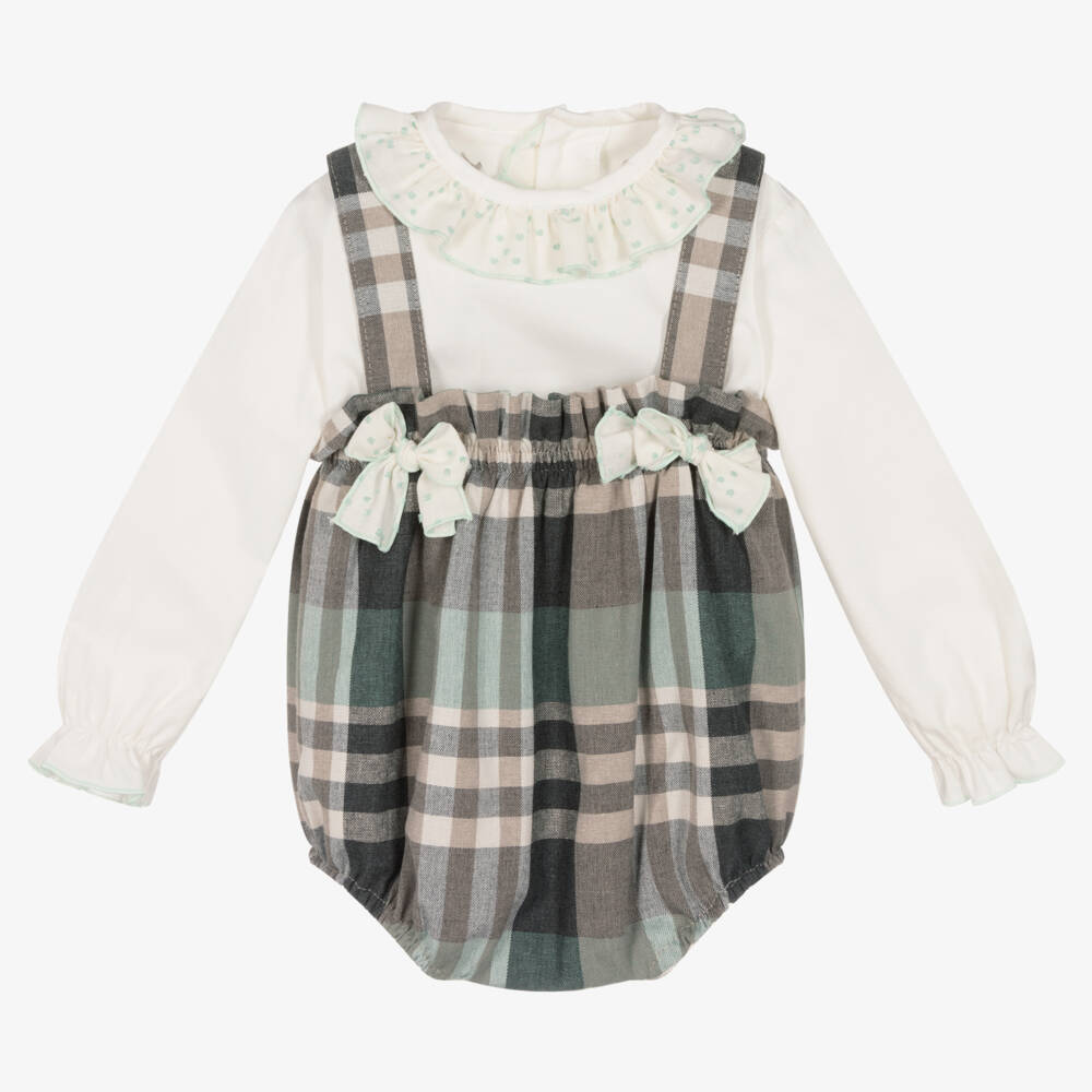 This ivory, charcoal grey and turquoise green shortie set for little girls is by Abuela Tata. Soft and comfortable, the blouse is made in soft cotton twill, with a charming mint blue plumeti dot pattern on the ruffle collar, pearlescent button fastenings on the back, and embroidered edges on the cuffs. In a lovely checked pattern, the shortie has matching dotted bows below the shoulder straps. It is lined with cotton-mix voile and elasticated on the neckline and cuffs for a comfortable fit and ease of dressing.