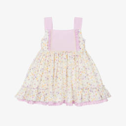 So beautiful for a special occasion, this off-white ruffled tulle dress for girls is from Abuela Tata. The neckline is trimmed with intricate guipure lace for a traditional look. It buttons up on the back and is fully lined for comfort, with a frilled underskirt for added volume. The detachable pink sash slides into the included bow for a gorgeous finishing touch.