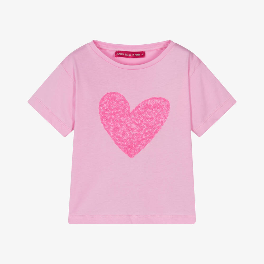 A casual pink cotton T-shirt for girls by Agatha Ruiz de la Prada. Made in soft and comfortable jersey with a relaxed fit, it is beautifully embroidered with a neon pink heart on the front.